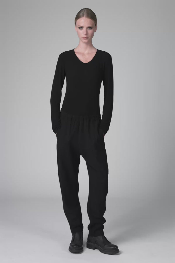 Stretch viscose and wool trousers with a comfort fit around the waist that tapers to a close fit around the calf. Featuring cuts on the back and front, an elastic waistband for enhanced comfort, two welt pockets on the front and a mock welt pocket on the back.